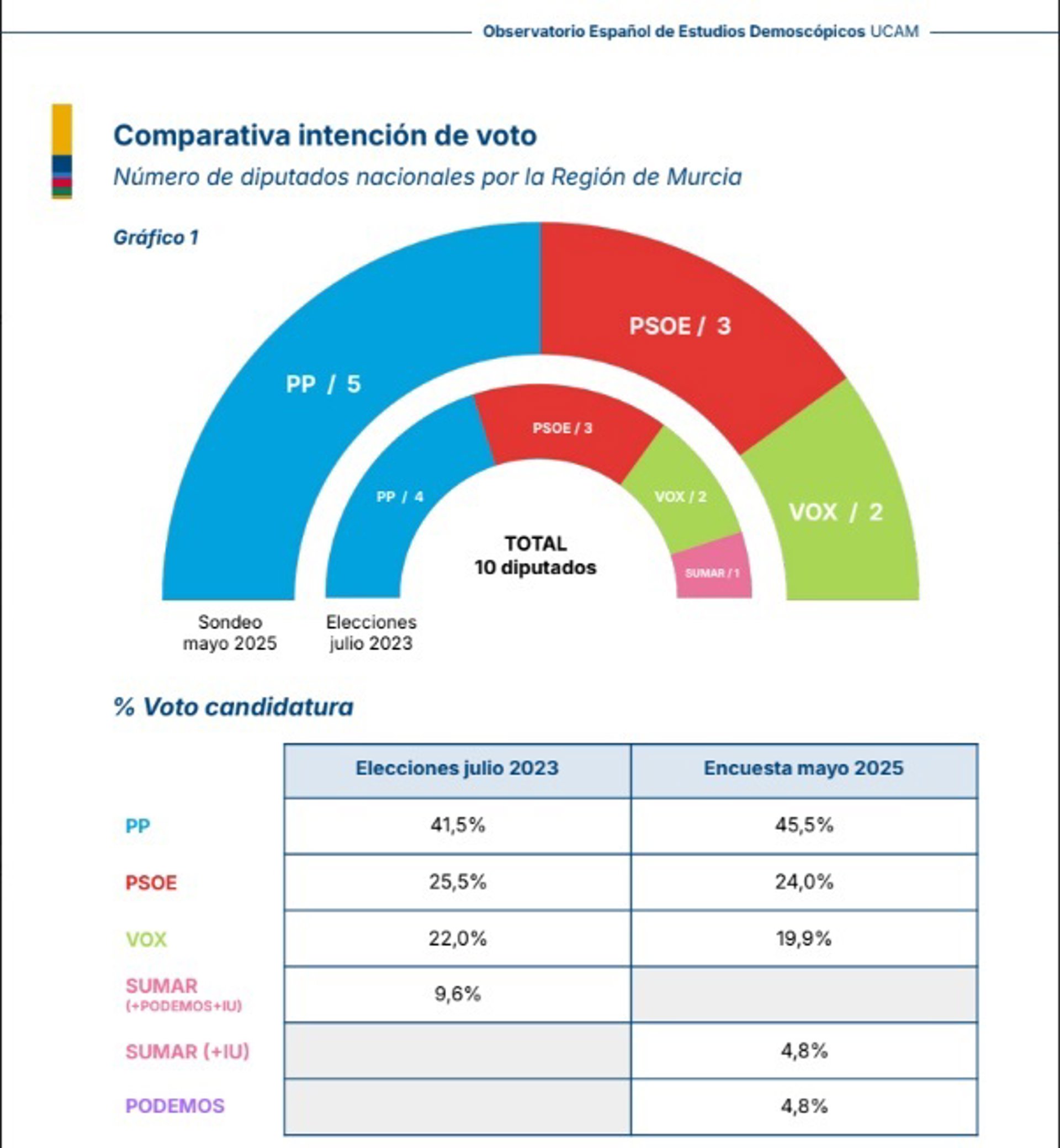 Mientras tanto, SUMAR perdería el único escaño que tiene actualmente, según se desprende del 'Barómetro de la Región de Murcia-mayo 2025' elaborado por el Observatorio Español de Estudios Demoscópicos de la UCAM (OBEDE) en base a una encuesta elaborada en base a 800 entrevistas efectuadas entre el 29 de abril y el 19 de mayo, con un error muestral del 3,54%.