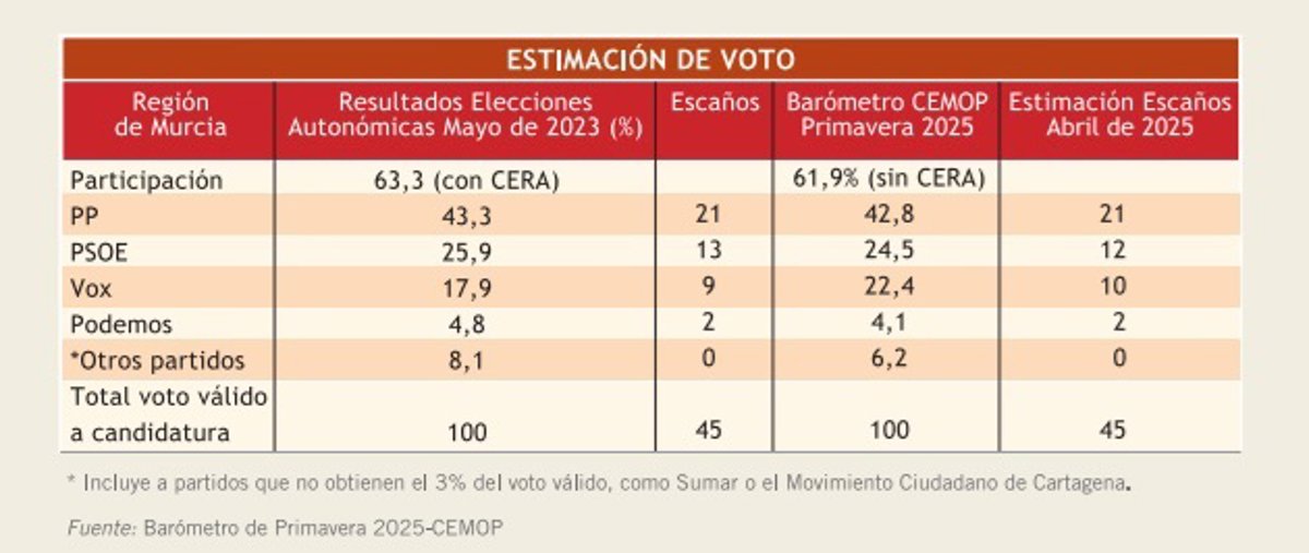 Vox continuaría como la tercera fuerza en la Región, con el 22,4% de los votos y diez escaños --uno más con respecto a los conseguidos en 2023--; y Unidas Podemos obtendría un 4,1% de los votos y mantendría sus 2 escaños --los mismos que tiene actualmente.