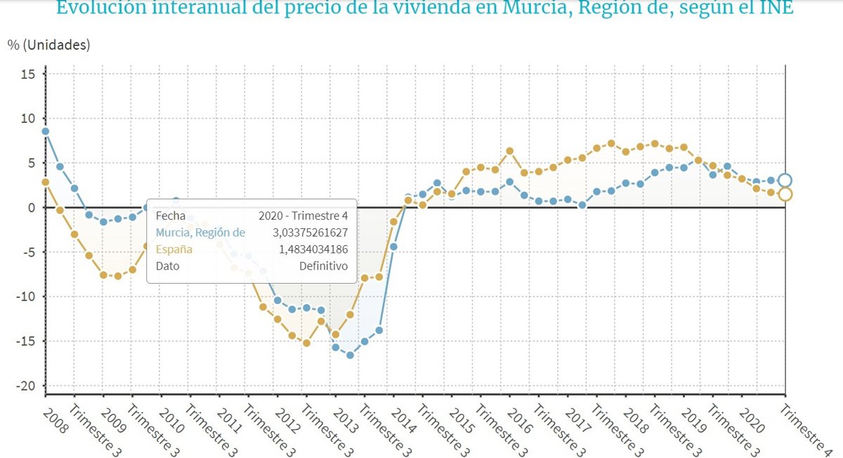 El precio medio de la vivienda libre subió en la Región de Murcia un 3% en el cuarto trimestre de 2020 en tasa interanual, lo que supone el mayor aumento por comunidades autónomas, según el Índice de Precios de Vivienda (IPV) del Instituto Nacional de Estadística (INE) publicado este martes.