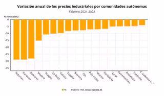 La evolución de los precios industriales en febrero es consecuencia del retroceso experimentado por la energía, que recortó 11,4 puntos su tasa interanual, hasta el -24,2%, por el abaratamiento de la producción, transporte y distribución de energía eléctrica, frente al aumento de precios que experimentó en febrero de 2023.