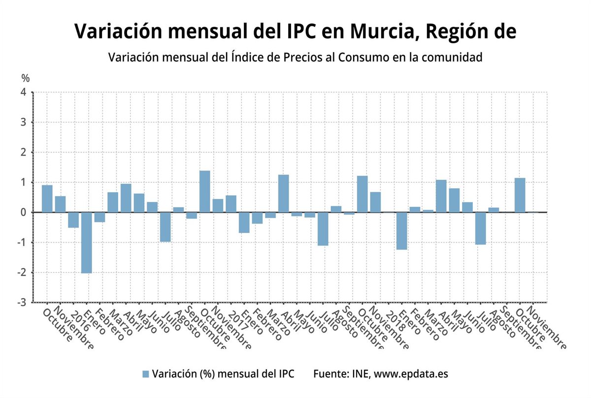 El Índice de Precios de Consumo (IPC) en la Región de Murcia no experimentó variación (0 por ciento) y se mantuvo estable el pasado mes de noviembre, mientras que en el conjunto nacional bajó una décima, según los datos hechos públicos este viernes por el Instituto Nacional de Estadística (INE).