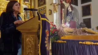 En su pregón, María Dolores García reflexionó sobre el profundo simbolismo del Santo Sepulcro, destacando que, aunque en la cruz se muestra la máxima humildad y sacrificio de Cristo, en el sepulcro yace nuestra esperanza. "El sepulcro no es el final, sino la certeza de la victoria", con estas palabras la presidenta invitaba a confiar en la resurrección y el amor incondicional de Dios, incluso en los momentos más oscuros.