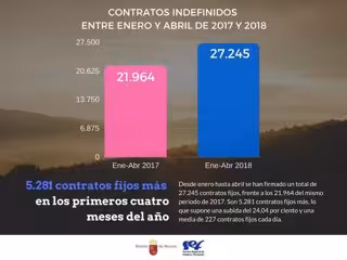 El primer cuatrimestre de 2018 está reflejando un incremento de la contratación indefinida en la Región. En concreto, desde enero hasta abril se han firmado un total de 27.245 contratos fijos, mientras que en esos primeros cuatro meses del pasado año se formalizaron 21.964.