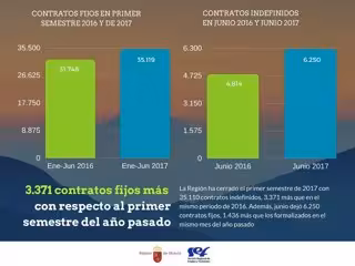 La Región de Murcia ha cerrado el primer semestre de 2017 con un balance de 3.371 contratos indefinidos más que en el mismo periodo de 2016. En concreto, desde el 1 de enero hasta el 30 de junio se acumulan 35.119 contratos fijos, frente a los 31.748 vínculos de este tipo que se registraban a estas alturas del pasado año.
