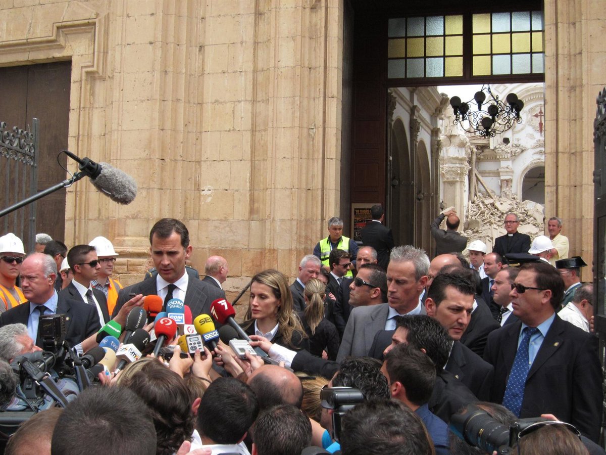 Don Felipe ha hecho estas declaraciones durante su visita, junto a doña Letizia y autoridades políticas, a la Iglesia de Santiago, "tremendamente" afectada, ya que su torre está resquebrajada y el techo totalmente hundido.