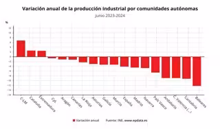 La tasa anual de la producción industrial se incrementa en dos comunidades autónomas y disminuye en otras 15. Castilla-La Mancha (+6,8 por ciento) y Extremadura (+2,5) fueron las que experimentaron incrementos; mientras que en el lado opuesto se sitúan Baleares (-12,2), Cantabria (-9,2), Andalucía y Comunidad Valenciana (-8,9 ambos).
