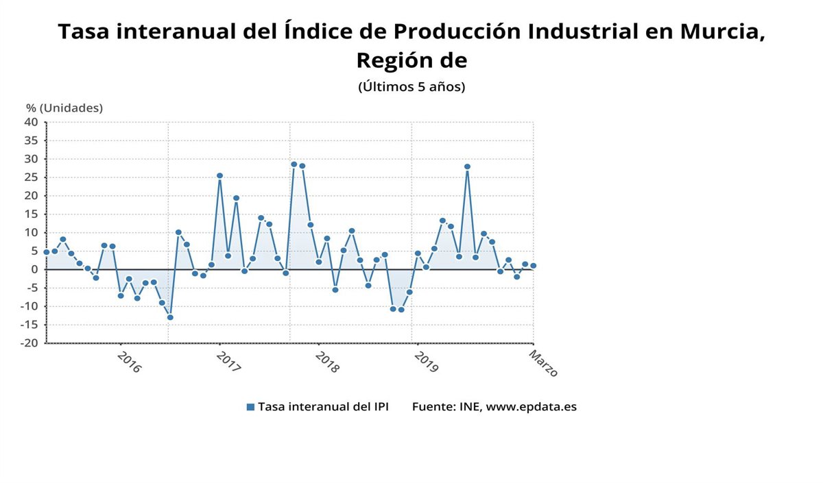 La producción industrial en la Región de Murcia en el mes de marzo de 2020 experimentó un aumento del 1,1% respecto al mismo mes del año anterior, el mayor crecimiento por comunidades autónomas. El conjunto de España registró un descenso del 10,2%, según ha informado este viernes el Instituto Nacional de Estadística (INE).