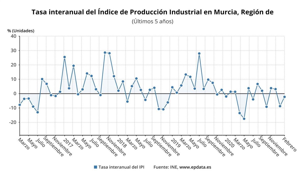 La producción industrial en la Región de Murcia en el mes de marzo experimentó un crecimiento del 3,1% respecto al mismo mes del año anterior. Para el conjunto de España se produjo una variación del 15,1%.