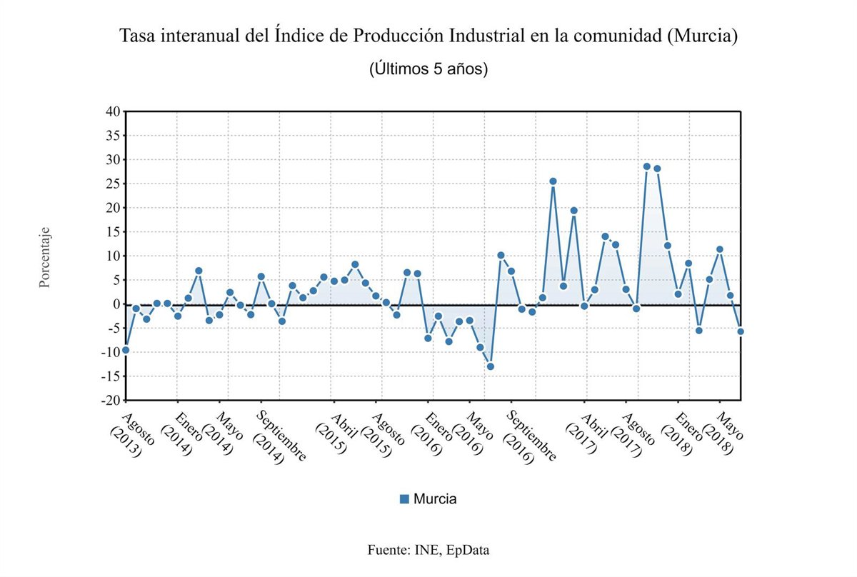 La producción industrial en la Región de Murcia en el mes de julio de 2018 descendió un 5,7% frente al mismo mes del año anterior, mientras que para el conjunto de España aumentó un 2,8%, según los datos publicados este viernes por el Instituto Nacional de Estadística.