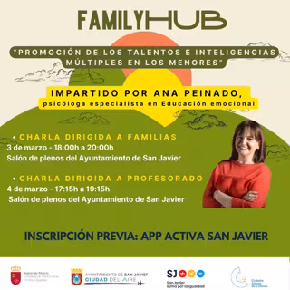 El taller para familias tendrá lugar el martes 3 de marzo, de 18.00 a 20.00 horas, y del profesorado el miércoles 4 de marzo, de 17.15 a 19.15, ambos en el salón de plenos del Ayuntamiento de San Javier. Las inscripciones, que serán gratuitas, se realizan desde la aplicación 'Activa San Javier'.