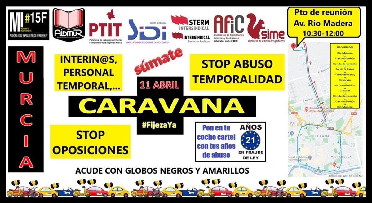 Por último, consideramos "de justicia" llamar a la movilización al funcionariado interino, a los trabajadores y trabajadoras temporales y a la ciudadanía murciana en general, y que se sumen a la manifestación en coche que tendrá lugar en la ciudad de Murcia (desde la avenida Río Madera junto a la avenida Juan de Borbón), el próximo 11 de abril, de 10.30 a 12.00 horas, bajo el lema '#STOP ABUSO TEMPORALIDAD' organizada por la Asociación AIDMUR.