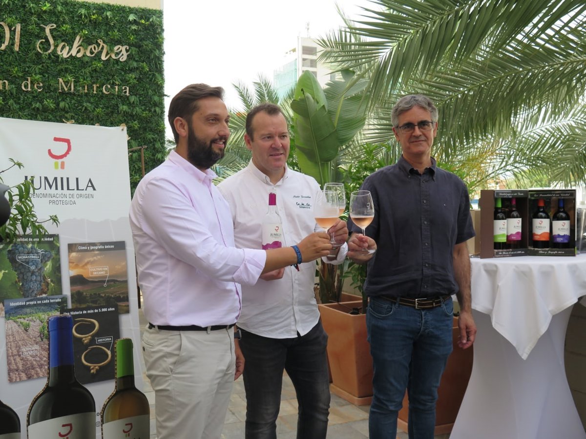 El director del Itrem, Juan Francisco Martínez (i), Pablo González-Conejero, chef de Cabaña-Buenavista , y Silvano García, presidente del Consejo Regulador de la DOP Vinos de Jumilla - CARM