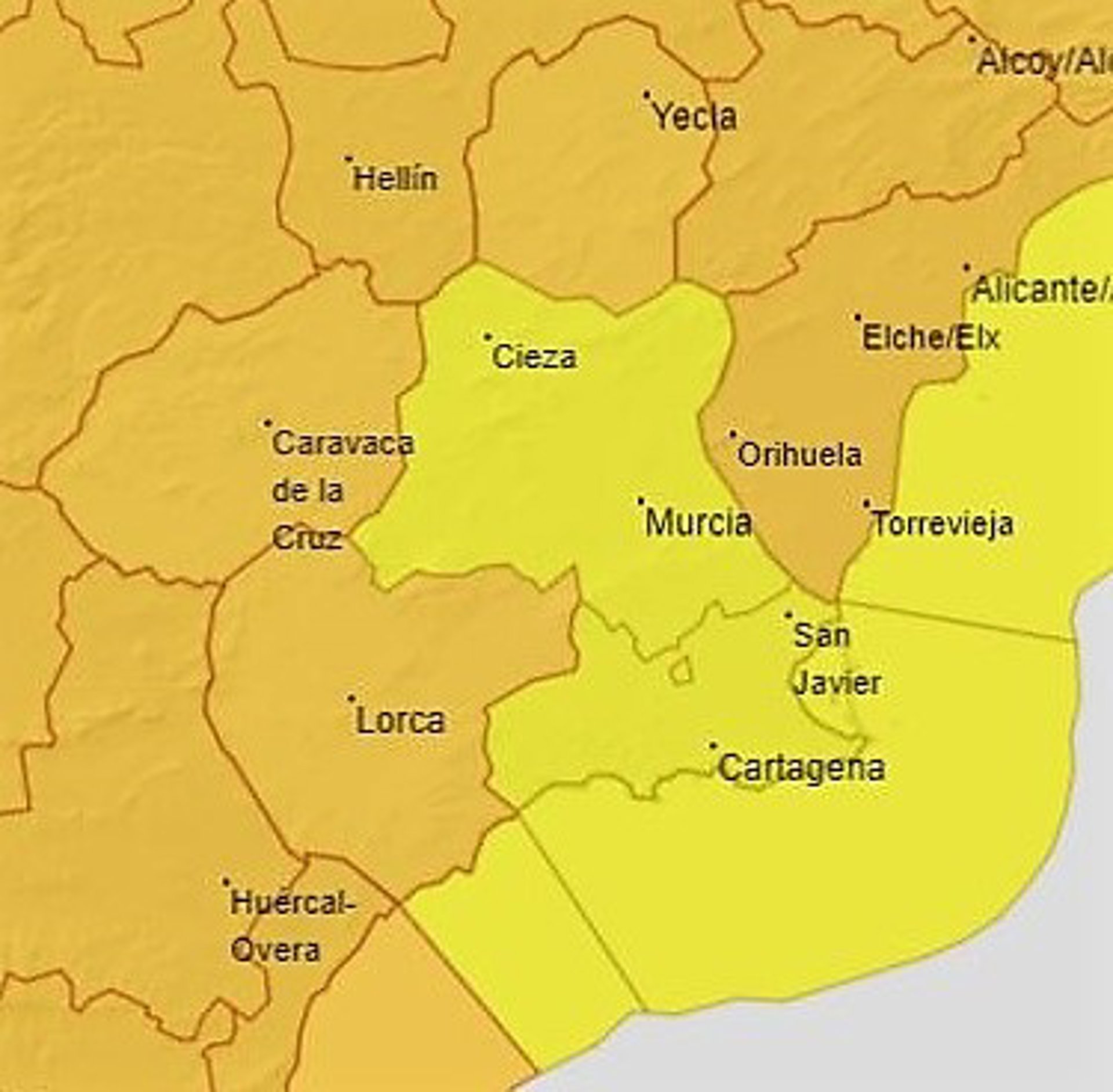 Para la Comarca del Altiplano ha emitido dos alertas, un aviso amarillo por vientos que pueden alcanzar rachas máximas de 80 km/h. El episodio de viento tiene previsto su inicio a las 6.00 horas del lunes 2 de marzo y se mantendrá dicha hasta las 10.00 horas, por vientos de componente oeste.