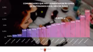 Además, la Región de Murcia es la tercera comunidad autónoma que menos autónomos pierde con respecto a hace un año. Tras junio de 2019, este colectivo registraba 100.71 trabajadores, lo que refleja que a día de hoy se acumula una bajada del 0,39 por ciento en esa cifra (392 menos). En términos relativos, sólo Andalucía (que hoy tiene un 0,20 por ciento más de autónomos que hace un año) y Canarias (0,05 por ciento menos) mejoran el dato de la Región.