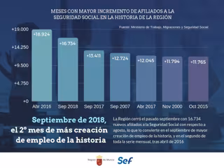 La serie histórica, que se inició en 1982, refleja además que septiembre de 2018 se convierte en el segundo mes con un mayor aumento de afiliados a la Seguridad Social en la Región de Murcia, sólo por detrás de los casi 19.000 más que se registraron en abril de 2016.