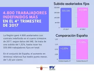 La Región de Murcia ganó un total de 4.800 asalariados con contrato indefinido en el cuarto y último trimestre de 2017, según datos reflejados en la reciente Encuesta de Población Activa (EPA). En concreto, se ha pasado de los 315.100 trabajadores con contrato estable a los actuales 319.900, lo que supone un incremento del 1,52 por ciento.