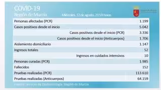 El número de afectados total en la Región de Murcia desde el inicio del brote de la pandemia del coronavirus asciende a 5.042 personas, de los que 3.336 casos han sido acreditados mediante PCR (125 más que el día anterior), según los datos del Servicio de Epidemiología correspondientes a este miércoles a las 23.59 horas.