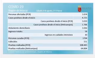 El número total de afectados en la Región de Murcia desde el inicio de la pandemia asciende a 4.725 personas, de los que 3.019 casos han sido acreditados mediante PCR (91 más que el día anterior), según los datos del Servicio de Epidemiología correspondientes a este sábado a las 23.59 horas.