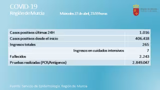 La Región de Murcia ha registrado en las últimas 24 horas un total de 1.016 casos nuevos de coronavirus, la misma cifra que el día anterior, y un fallecido por esta causa, según los últimos datos publicados por la Consejería de Salud.