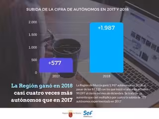 La Región de Murcia ganó 1.987 autónomos en 2018, al pasar de los 97.110 con los que inició el año a los actuales 99.097, al cierre del mes de diciembre. Se trata por tanto de un incremento anual del 2,05 por ciento, que está por encima del incremento medio del 1,56 por ciento registrado en el conjunto del país. En 2017 el aumento en términos absolutos fue menor, de 577 autónomos, lo que supuso una subida del 0,60 por ciento.