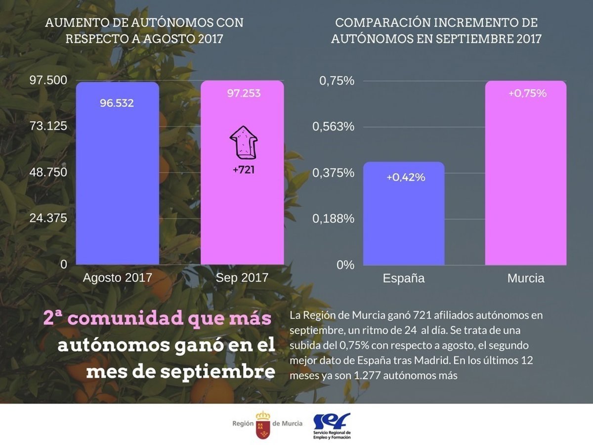 Se trata de una subida del 0,75 por ciento, la segunda mayor por comunidades autónomas, sólo por detrás de Madrid, frente al 0,42 por ciento de incremento en el país. Esta tendencia positiva en la comparación con el dato nacional se reproduce también si tenemos en cuenta los últimos doce meses, ya que en ese periodo la Región registra un crecimiento del 1,33 por ciento del número de autónomos, mientras que en España la subida es del 0,97 por ciento.