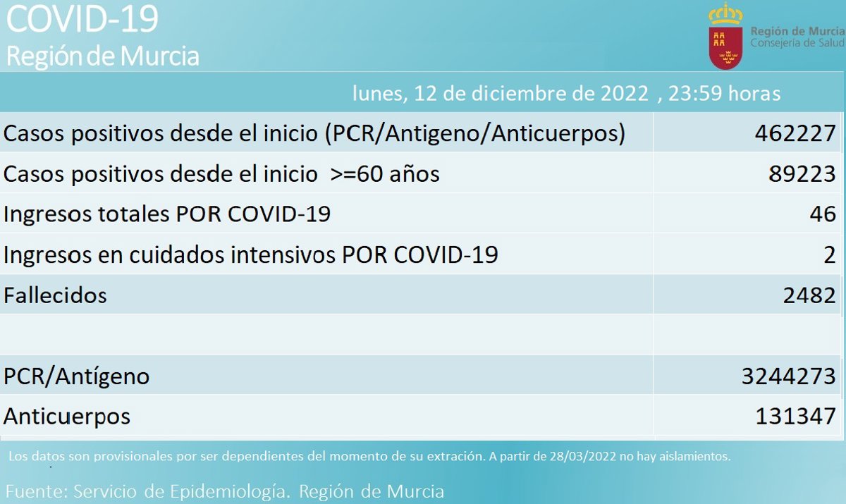 Desde el inicio de la pandemia, la cifra de casos detectados por Salud en la Región ha ascendido hasta los 462.227, de los que 89.223 son personas de 60 o más años, y la de fallecidos se sitúa en 2.482.