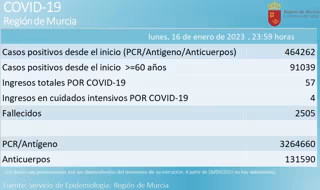 Desde el inicio de la pandemia, la cifra de casos detectados por Salud en la Región ha ascendido hasta los 464.262, de los que 91.039 son personas de 60 o más años, y la de fallecidos se sitúa en 2.505.