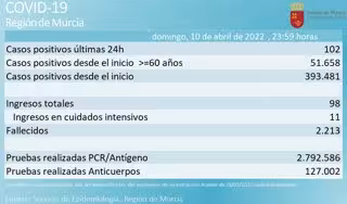 La Región de Murcia ha registrado en las últimas 24 horas un total de 102 casos nuevos de coronavirus y ningún fallecido por esta causa, según refleja la página web de la Consejería de Salud.