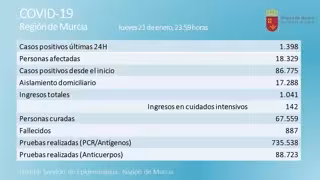 La cifra de nuevos casos de coronavirus en la Región de Murcia se ha situado en 1.398 en las últimas 24 horas, en una jornada en la que han fallecido 19 personas por Covid-19, la cifra más alta de toda la pandemia en una sola jornada. Se trata de 8 mujeres y 11 varones de 90, 94, 85, 68, 82, 80, 54, 54, 86, 85, 88, 73, 85, 62, 75, 83, 82, 73 y 74 años, 4 de Cartagena, 3 de Murcia, 2 de Fortuna y el resto de Mula, Alhama, Lorca, Totana, Yecla, Cieza, Alcantarilla, Torres Cotillas, Alguazas y Fuente Alamo.