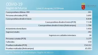 El número total de afectados en la Región de Murcia desde el comienzo de la crisis asciende a 8.834, de los que 7.128 han sido acreditados mediante PCR (281 más que el día anterior), según los datos del Servicio de Epidemiología correspondientes a este lunes a las 23.59 horas.