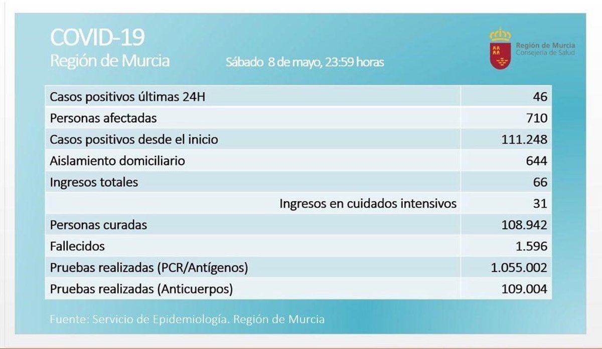 La Región de Murcia ha registrado 46 nuevos casos positivos por Covid-19 hasta las 23.59 horas de este sábado, en una jornada sin fallecidos por esta causa, según han informado fuentes de la Consejería de Salud.