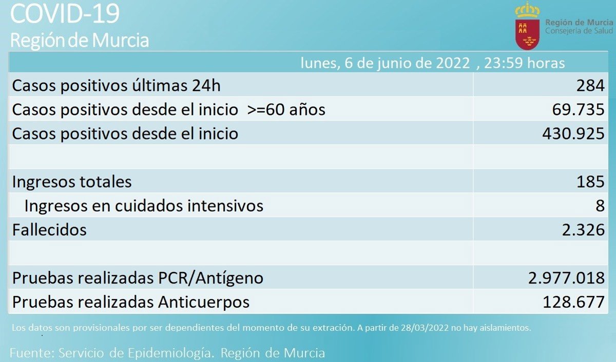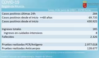 En estos momentos, 185 personas están ingresadas por Covid-19 en los hospitales murcianos --26 menos que en el último parte ofrecido por el departamento encabezado por Juan José Pedreño el pasado jueves--, ocho de ellas en las Unidades de Cuidados Intensivos (UCI), seis menos.