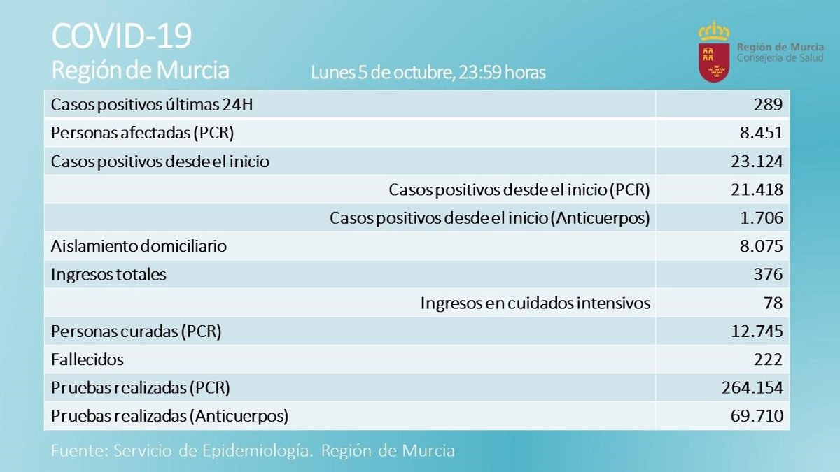 Tabla actualizada sobre la incidencia del Covid-19 en la Región de Murcia en las últimas 24 horas - CARM