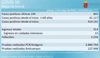 La Región de Murcia ha registrado en las últimas 24 horas un total de 865 casos nuevos de coronavirus, 81 menos que en la jornada anterior, y con un fallecido por esta causa, según los últimos datos publicados por la Consejería de Salud.