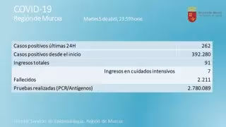 La Región de Murcia ha registrado en las últimas 24 horas un total de 262 casos nuevos de coronavirus, diez menos que en la jornada anterior, y dos fallecidos por esta causa. Se trata de dos varones de 63 y 76 años de las áreas de salud I (Murcia Oeste) y III (Lorca), han informado fuentes de la Consejería de Salud.