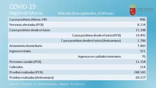 De los 406 nuevos casos, 95 corresponden al municipio de Murcia, 50 a Totana, 44 a Lorca, 41 a Molina de Segura, 22 a San Javier, 16 a Cartagena, 14 a Archena, 14 a Ceutí, 13 a Alhama de Murcia, 13 a Jumilla, 10 a Alcantarilla, 7 a Las Torres de Cotillas, 7 a Yecla, 6 a Fortuna, 5 a Abanilla, y 5 a Caravaca de la Cruz. El resto están repartidos entre diversas localidades.