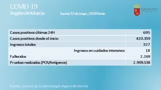 La Región de Murcia ha registrado en las últimas 24 horas un total de 695 casos nuevos de coronavirus, 117 menos que el día anterior, y cuatro fallecidos por esta causa, según los últimos datos publicados por la Consejería de Salud.