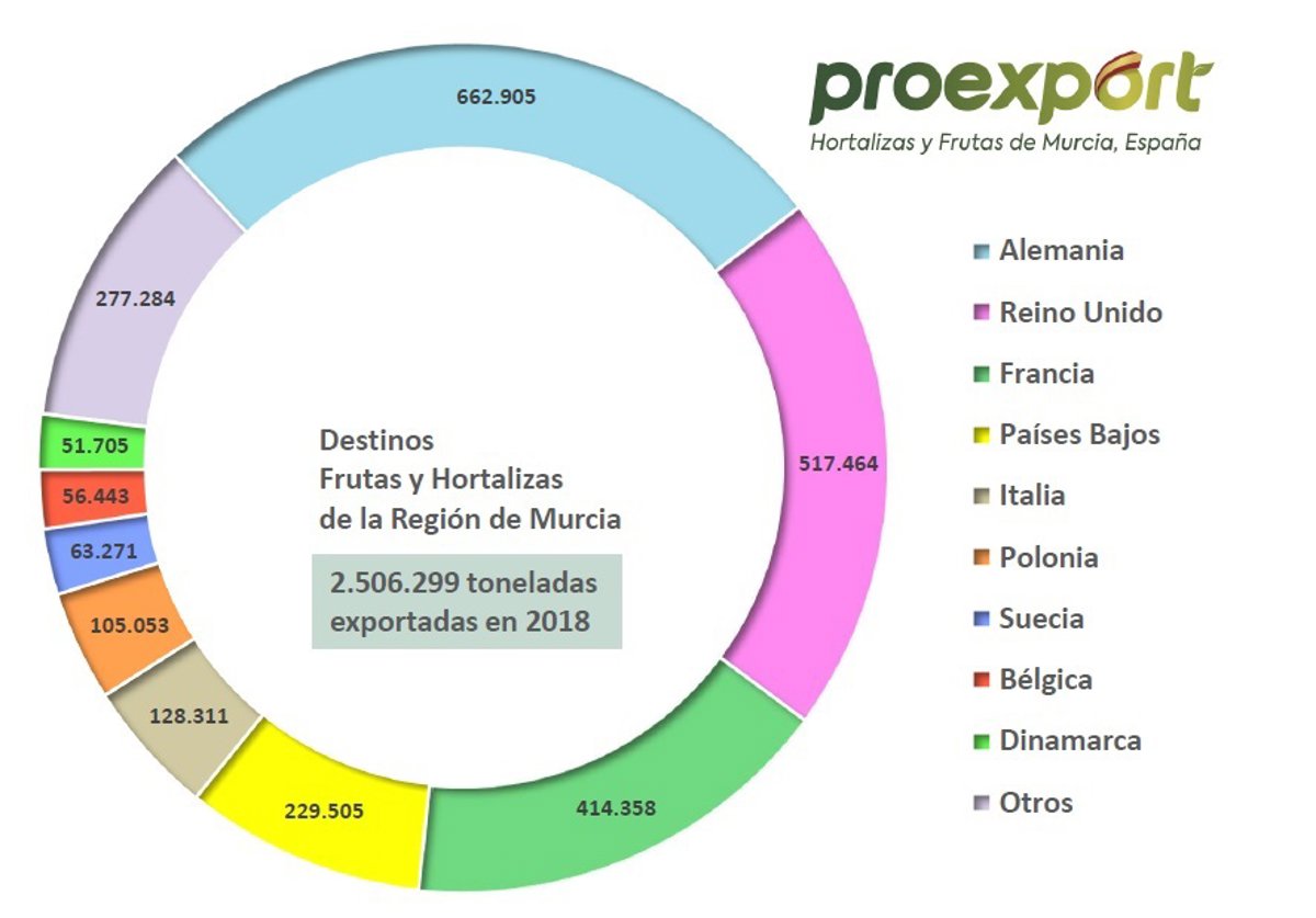 Por países, Alemania se mantiene como el principal destino de las exportaciones hortofrutícolas murcianas. Con 627 millones de euros y 662.905 toneladas, recibió el 25% del total exportado por la Región en 2018. Reino Unido es el segundo país de referencia para las frutas y hortalizas murcianas con 580 millones de euros y 517.464 toneladas (23,2% del total) y Francia se sitúa en tercer lugar con 415 millones de euros y 414.358 toneladas, el 16,6% de las expediciones murcianas. Estos tres destinos representan el 64,8% de lo que la Región vendió.