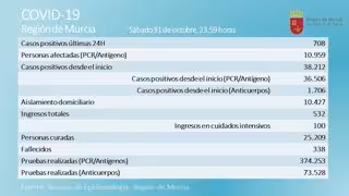 De los 708 nuevos casos, 211 corresponden al municipio de Murcia, 64 a Cartagena, 37 a Totana, 34 a Jumilla, 33 a Molina de Segura, 32 a Lorca, 27 a Alcantarilla, 26 a Torre Pacheco, 22 a Cieza, 18 a Fuente Álamo, 18 a Las Torres de Cotillas, 17 a Archena, 14 a Alhama de Murcia, 14 a Caravaca de la Cruz, 14 a Cehegín, 12 a Águilas, 12 a Yecla, 11 a Alguazas, 11 a San Javier, 9 a Ceutí, 8 a Moratalla, 7 a Mazarrón, y 6 a Los Alcázares. El resto están repartidos entre diversas localidades.