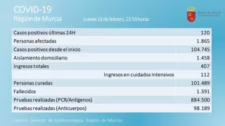 El número de casos activos se sitúa en 1.865 en la Región de Murcia (412 menos que en la jornada anterior), de los que 407 están ingresados en centros hospitalarios (17 menos). De ellos, 112 se encuentran en cuidados intensivos (dos más).