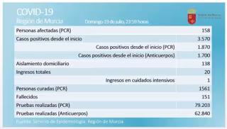 La Región de Murcia ha registrado 19 casos activos más por coronavirus con respecto al día anterior (21 positivos más por PCR) y la cifra ha ascendido hasta los 158, según el balance correspondiente a las 23.59 horas de este domingo publicado por la Consejería de Salud.