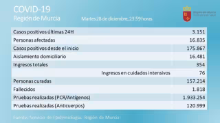 La Región de Murcia ha registrado 3.151 nuevos casos positivos por Covid-19 en las últimas 24 horas, la cifra más alta desde el inicio de la pandemia, en una jornada con siete fallecidos por esta causa. Se trata de cinco varones y dos mujeres de 64, 72, 84, 85, 57, 94 y 81 años, 5 del área de salud II (Cartagena), uno del área de salud V (Altiplano) y uno del área VIII (Mar Menor).