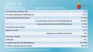 El número total de afectados por Covid-19 en la Región de Murcia desde el comienzo de la pandemia se sitúa en 51.666 casos, de los que 49.960 han sido acreditados mediante PCR o test de antígenos, y 1.706 a través de pruebas de anticuerpos.