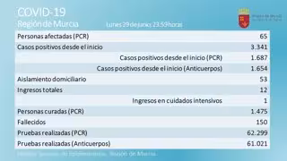 La Región ha registrado tres nuevos contagiados por COVID-19 curados en las últimas 24 horas, así como cuatro afectados más respecto al día anterior, con 65 positivos, según el balance correspondiente a las 23.59 horas de este lunes publicado por la Consejería de Salud.