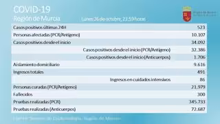 El número total de afectados en la Región de Murcia desde el comienzo de la crisis del coronavirus se sitúa en 34.092 casos, lo que supone 523 más que el día anterior. De todos ellos, 32.386 han sido acreditados mediante PCR, según los datos del Servicio de Epidemiología correspondientes a este lunes a las 23.59 horas.