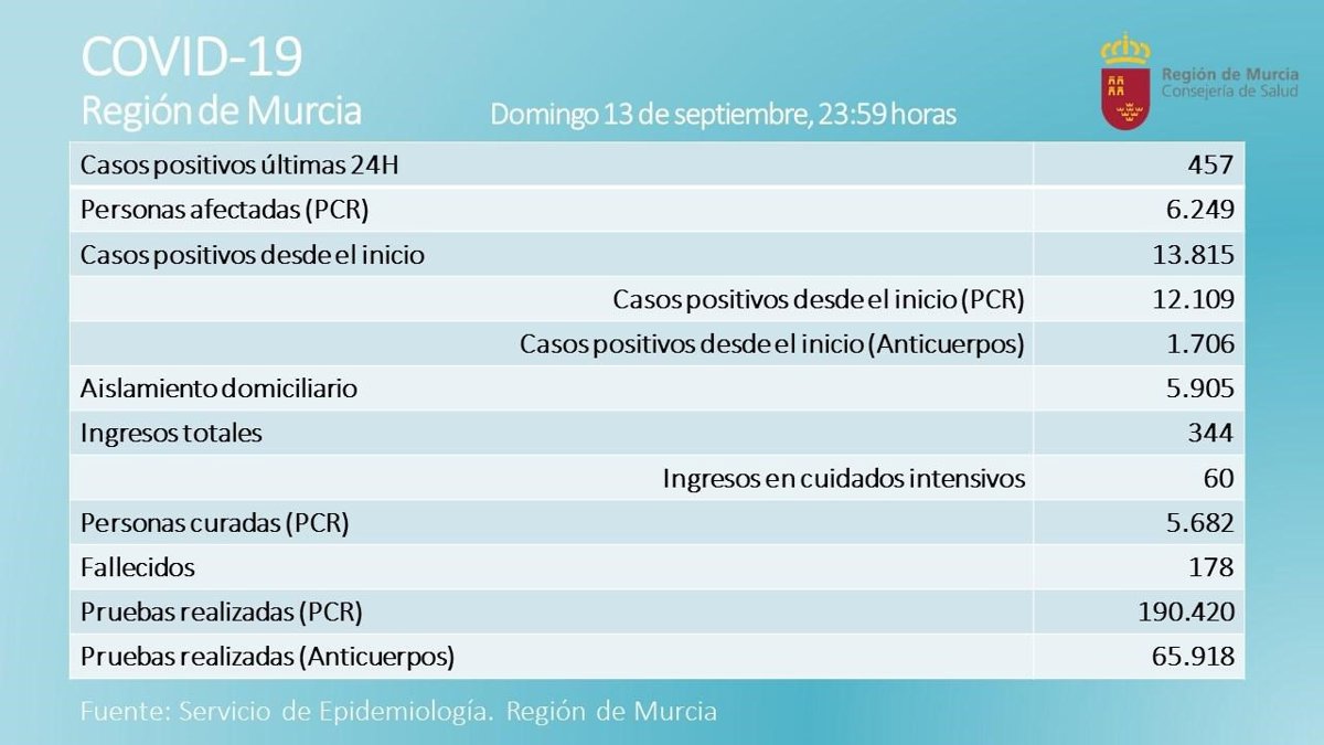De los 457 nuevos casos, 110 corresponden al municipio de Murcia, 95 a Lorca, 47 a Jumilla, 38 a Totana, 24 a Cartagena, 14 a Alcantarilla, 8 a Águilas, 8 a San javier, 8 a San Pedro del Pinatar, 7 a Fuente Álamo, 7 a Mazarrón, 7 a La Unión, 7 a Yecla, 6 a Alhama de Murcia, 6 a Archena, 6 a Cieza, 6 a Molina de Segura, 5 a Caravaca de la Cruz, 5 a Lorquí, 5 a Mula, y 5 a Puerto Lumbreras. El resto están repartidos entre diversas localidades