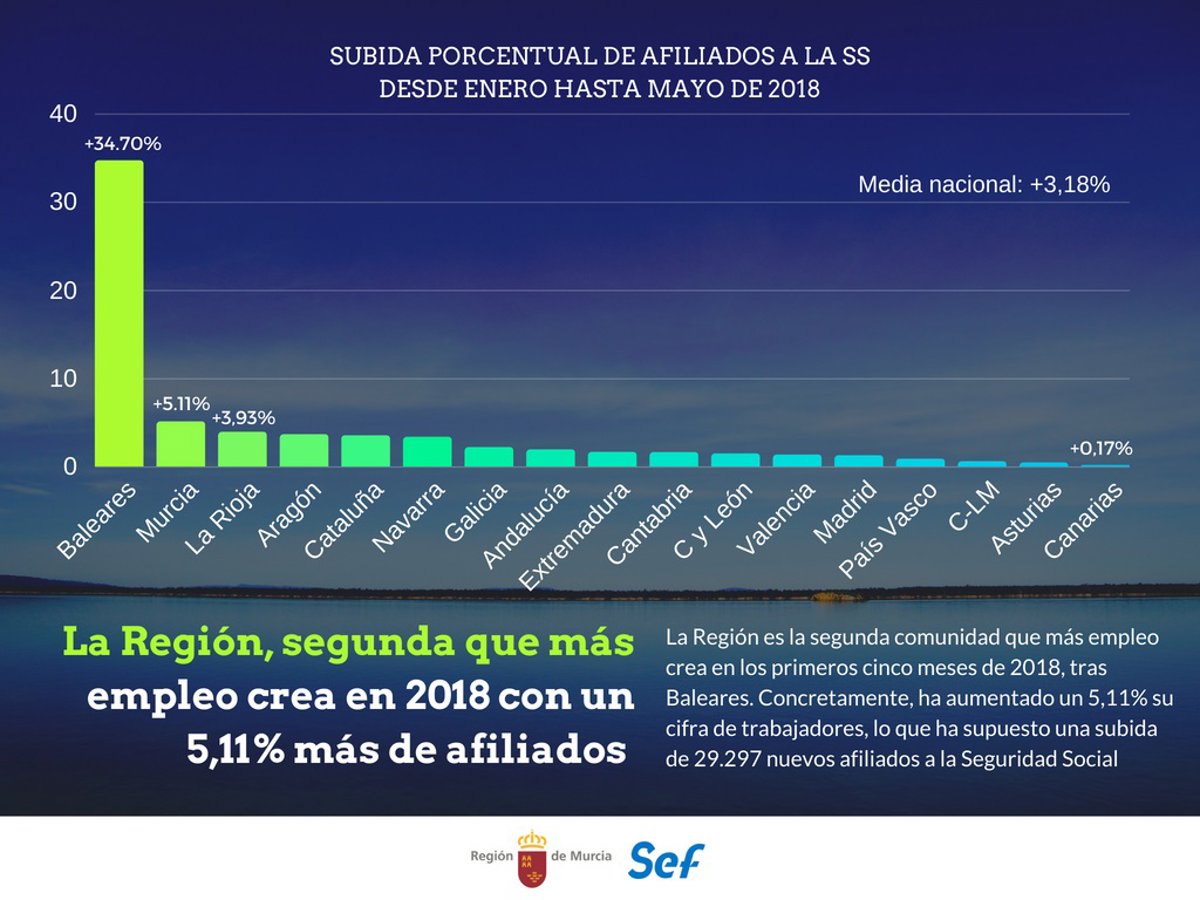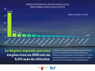 El Gobierno autonómico ha destacado que la Región de Murcia es la segunda comunidad que más empleo ha creado en los primeros cinco meses de 2018. Concretamente, su incremento de afiliados a la Seguridad Social desde enero hasta mayo es del 5,11 por ciento, una cifra que está por encima del 3,18 por ciento de subida media en España, y que sólo es superada por el 34,70 por ciento de aumento en Baleares, una autonomía especialmente marcada por el repunte del empleo vinculado al turismo.