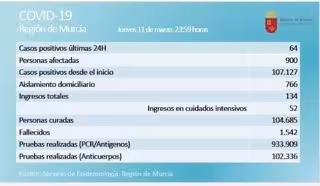 Así, la cifra de decesos registrados por esta enfermedad en la Comunidad asciende a 1.542, según los datos ofrecidos por el Servicio de Epidemiología correspondientes a este jueves a las 23.59 horas. El número total de afectados por Covid-19 en la Región de Murcia desde el comienzo de la pandemia se sitúa en 107.127.