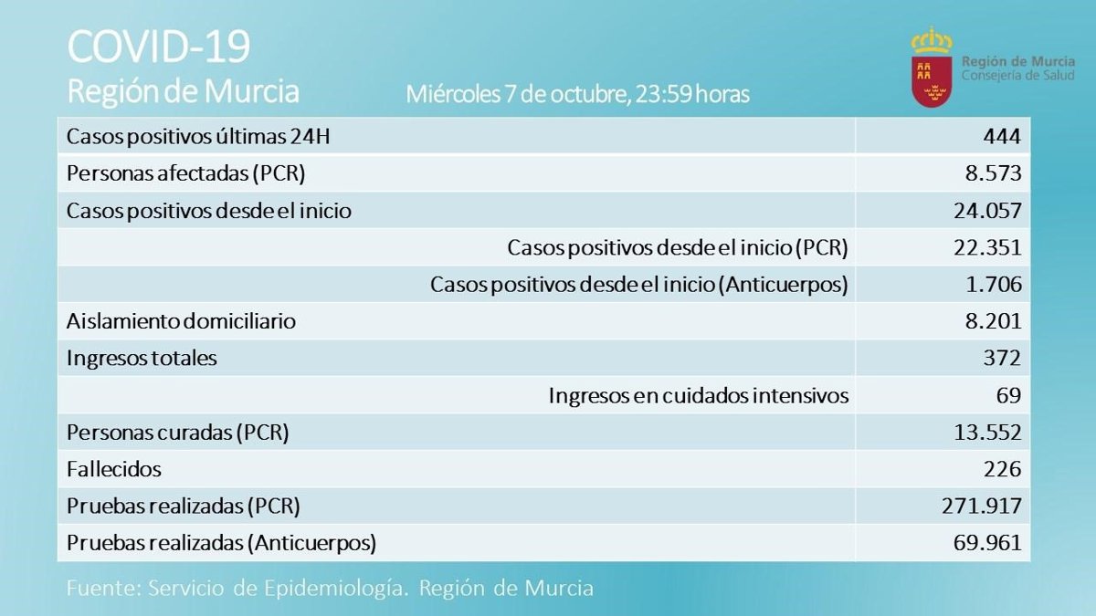 De los 444 nuevos casos, 89 corresponden al municipio de Murcia, 71 a Lorca, 50 a Cartagena, 45 a Totana, 26 a Molina de Segura, 19 a Jumilla, 14 a Archena, 13 a Torre Pacheco, 12 a Santomera, 11 a San Pedro del Pinatar, 9 a San Javier, 9 a Las Torres de Cotillas, 7 a Águilas, 7 a Alcantarilla, 6 a Alhama de Murcia, 6 a Cieza, y 6 a Fuente Álamo. El resto están repartidos entre diversas localidades.
