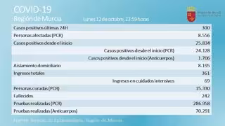 De los 300 nuevos casos, 127 corresponden al municipio de Murcia, 25 a Abanilla, 21 a Cartagena, 16 a Beniel, 15 a Cieza, 14 a Molina de Segura, 14 a Santomera, 13 a Alhama de Murcia, 8 a Las Torres de Cotillas, 7 a Alcantarilla, 6 a Fuente Álamo, 6 a Totana, y 5 a Archena. El resto están repartidos entre diversas localidades.
